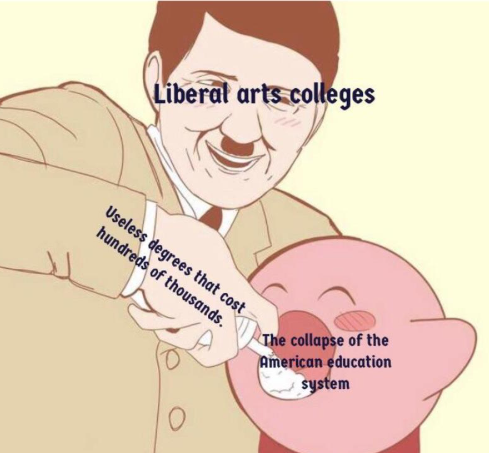 Like many things that one can find on the internet these days, the depiction is admittedly distasteful. With that acknowledged, the depiction does identify a real problem; that being the collapse of the American education system. Has the American education system collapsed yet? I would argue no. With that being said, how education and its outcomes are portrayed culturally should be a concern to anyone who is a member of the voting public. Humanities as a discipline has struggled to quantify its tangible outcomes to students for some time now. The issue is not only one of marketing, however.